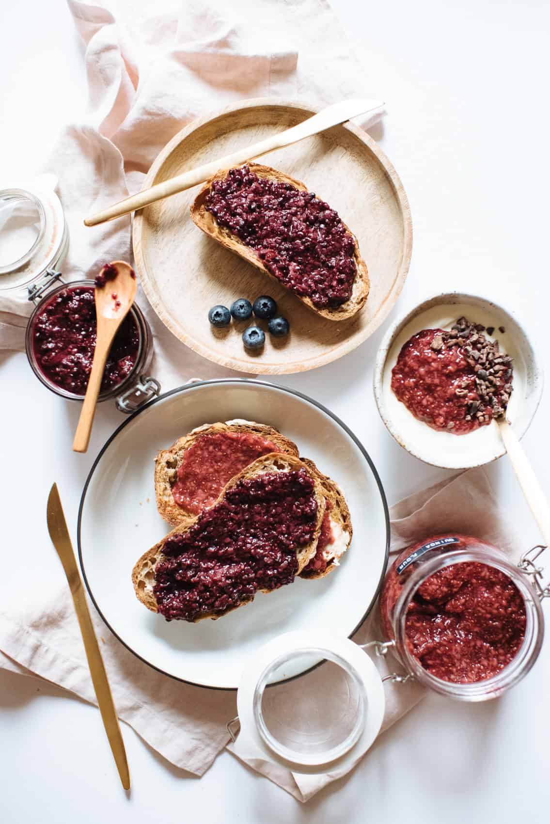 Een paar jaar snel vooruit en de jam is gebleven, maar in deze iets gezondere versie, gemaakt met bessen, chiazaadjes en honing. De chiazaadjes hebben bijna een magische kwaliteit die hen in de jam verandert zonder dat je liters suiker hoeft toe te voegen, wat de manier is waarop traditionele jam zijn heerlijke kleverigheid krijgt. Ze zijn zeker de moeite waard om te proberen als je gezond probeert te zijn, maar toch een beetje een zoetekauw bent. Als je dit nog nooit eerder hebt gedaan, zul je geschrokken zijn van hoe gemakkelijk het is, en een van die geweldige recepten als je niet met teveel ingrediënten wilt rotzooien (of, lui zoals ik!). Genieten!